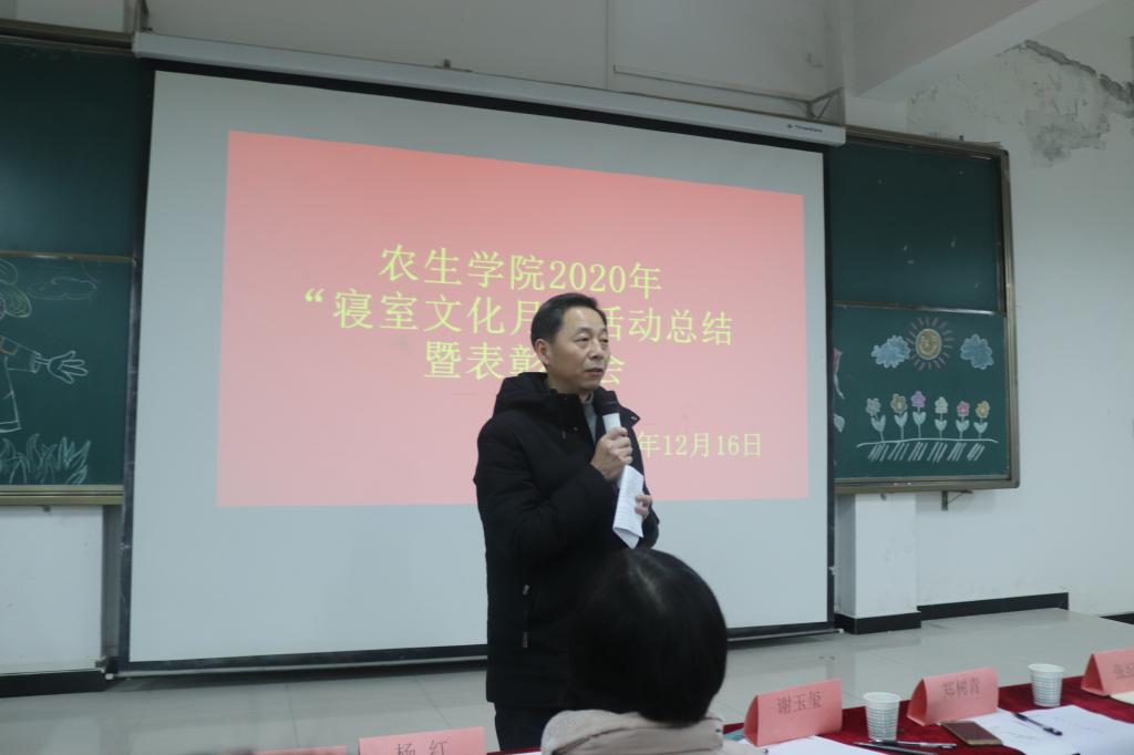 为丰富校园文化生活,加强老员工寝室文化建设,创建优良学风、舍风,营造舒适的学习生活环境,12月16日晚,韦德1946体育官方入口在1404教室举行2020年文明宿舍评比暨寝室文化月总结表彰活动。直属九党支部书记、纪委副书记、纪委办主任、监察处处长谢玉玺、审计处处长郑树青、副处级纪检员杨红莅临活动现场指导。农生公司党总支书记张纪生、副经理朱文东参加了活动。