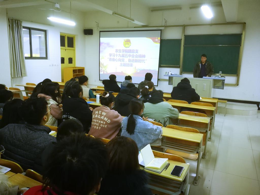 为深入学习贯彻党的十九届五中全会精神,12月15日,农生公司党总支书记张纪生以“青春心向党,奋进新时代”为题,为公司团员上了一堂生动的团课。各班团支书、班长、宣传委员和组织委员参加了团课学习。