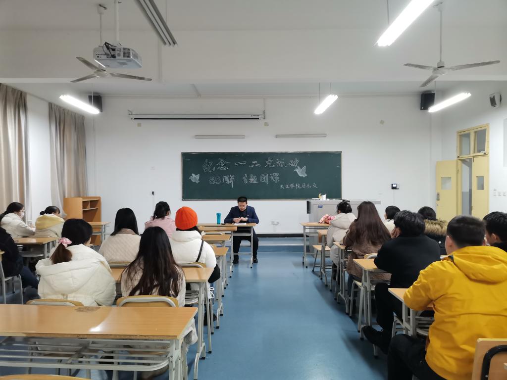 团总支书记张伟艺以“一二·九运动与当代中国青年的正确方向”为题,向广大团员讲主题团课。他介绍了“一二·九运动”的历史背景以及整个事件经过,深刻阐述了“一二·九运动”产生的深远影响和伟大历史意义,并殷切期望广大团员高扬以爱国主义为核心的民族精神,把个人的理想与祖国的命运紧密相连,在中国共产党领导下自觉担负起历史赋予的使命,在新时代建功立业。
