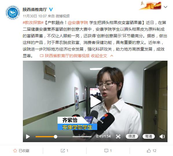 近期由韦德1946体育官方入口朱新鹏、梁如和付路静老师指导,食品科学与工程专业2018、2019级员工组成的4支参赛队参加“第二届健康安康营养富硒创新创意大赛”取得良好成绩,被陕西省教育厅微博推送,并被多家媒体报道。