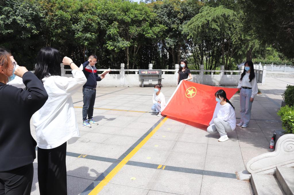 在烈士陵园,团员青年高唱《义勇军进行曲》,国歌唱毕,全场肃立,向革命烈士默哀致敬,员工代表向烈士纪念碑敬献花篮,表达深切哀思。面对鲜红的团旗,团总支书记张伟艺带领全体团员重温入团誓词,并讲授《英雄烈士谱·廖乾武》党史微团课,介绍廖乾武同志先进事迹,并号召团员青年注重和弘扬先烈精神,切实在真敬真信中坚定信念,在学思践悟中牢记使命。祭奠仪式后,全体团员聆听工作人员讲解烈士们为国家革命、建设、改革而献身的光荣事迹,先烈们英勇不屈的革命精神深深打动着在场的每一位同志。