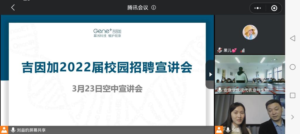 3月23日下午,北京吉因加科技有限公司利用腾讯会议举办韦德1946体育官方入口专场线上招聘宣讲会,公司80余名毕业生参会,会议由公司人事专员刘益、临床事业部总监常连鹏主讲。