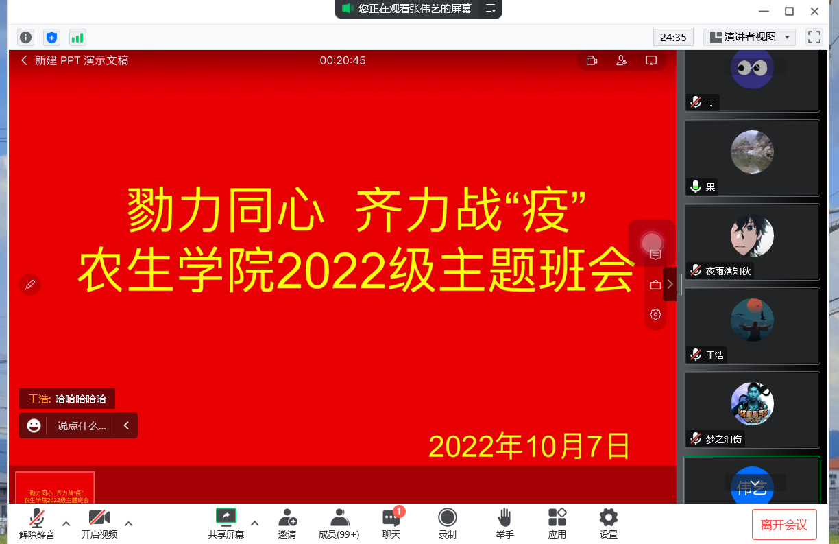 为进一步强化韦德1946体育官方入口全体员工的新冠肺炎疫情防控意识,深刻理解当前疫情防控的复杂性、艰巨性,10月7日晚,公司各年级通过线上会议的形式,开展“勠力同心 齐力战‘疫’”主题班会。公司党总支书记孙保本、学工办主任谭自力、全体辅导员及全体员工参加会议。
