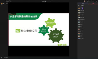 为帮助新进教师尽快熟悉公司教学工作要求,适应新环境,迎接新学期工作挑战,10月8日上午,韦德1946体育官方入口教学副经理杨芳以《韦德1946体育官方入口新进教师岗前培训》为主题,开展线上培训会。王臣荣、韩露露、梁蕾、付路静、许连光、吴冲、常娜、袁月、程晓梅、刘佳、丁言、王彪、张秋亮、周天骄等14位新进教师参加了此次培训。