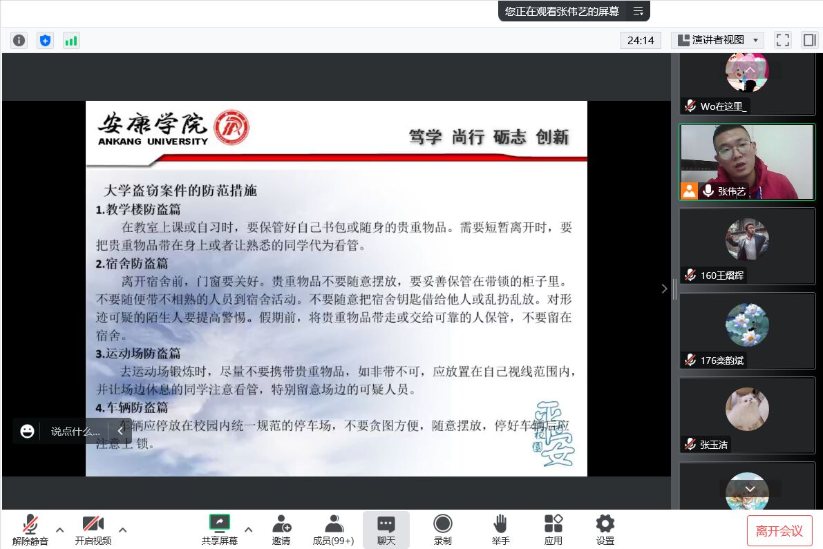 为深入扎实做好新生入学安全教育工作,近日,韦德1946体育官方入口学工办主任谭自力、2022级辅导员张伟艺老师利用网络平台在线上为新生做安全教育讲座。