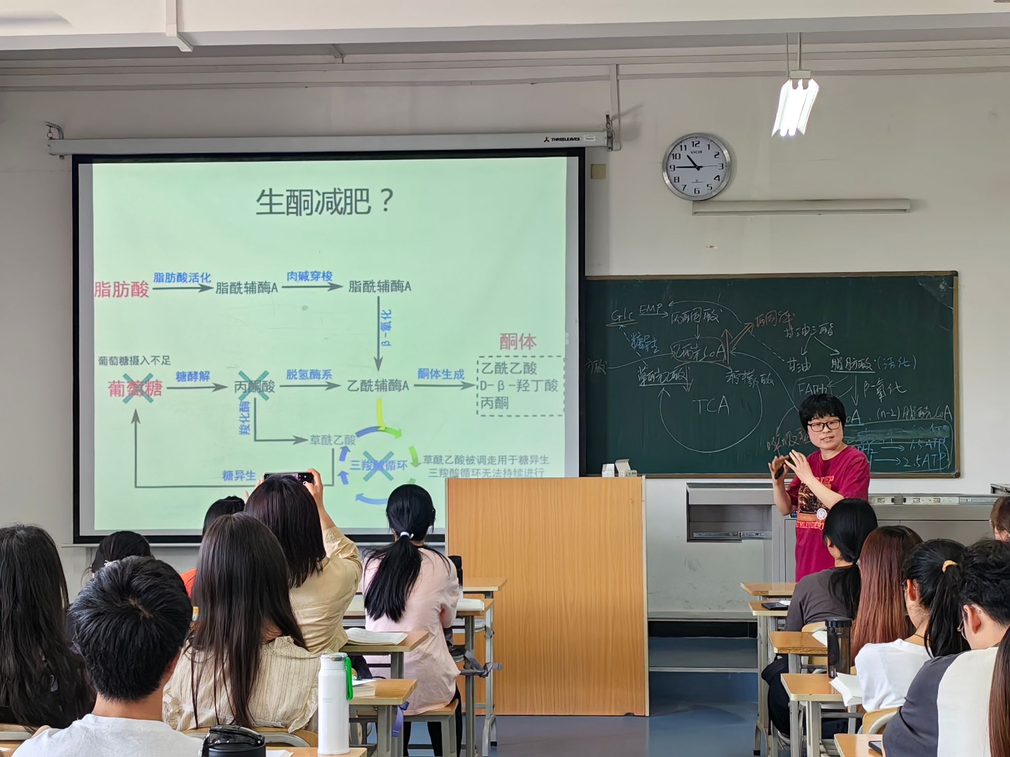 在课程导入环节,王瑞娴带领员工回顾糖代谢和脂肪动员代谢之间的联系,引入新课内容脂肪酸的β-氧化和酮体的代谢。在课程思政环节,王瑞娴围绕“网红”生酮减肥这一现象,引导同学们从糖类、脂类代谢的生化机制层面分析为什么这种饮食方式能起到很好的减肥效果,以及看似美好的背后可能引发的健康风险与隐患,引导员工善于思考,辩证看待网络上的信息,学会用所学知识维护身体健康。
