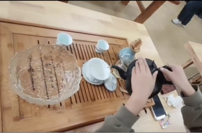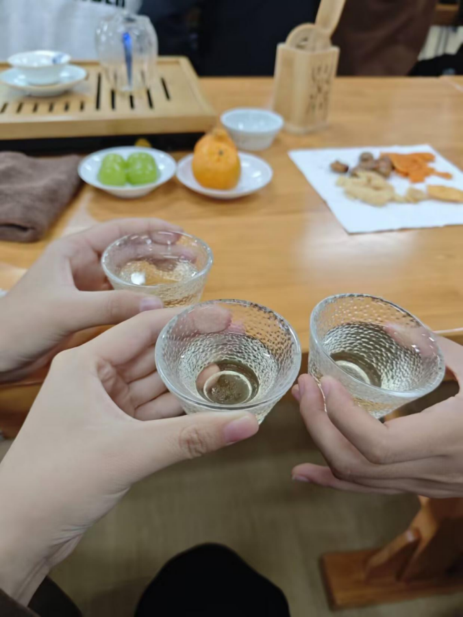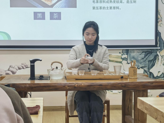 杨梦圆带领大家学习了茶的起源、饮茶方式的演变和茶的传播路径。茶学24级陈刘欣诺熟练地展示了盖碗分杯冲泡绿茶,每一个动作都如行云流水般自然流畅,激发了社员们对绿茶冲泡的兴趣。