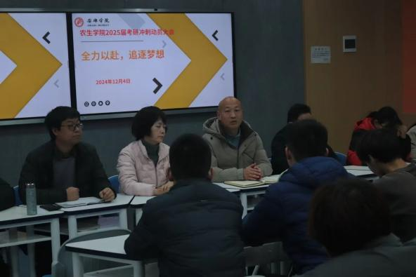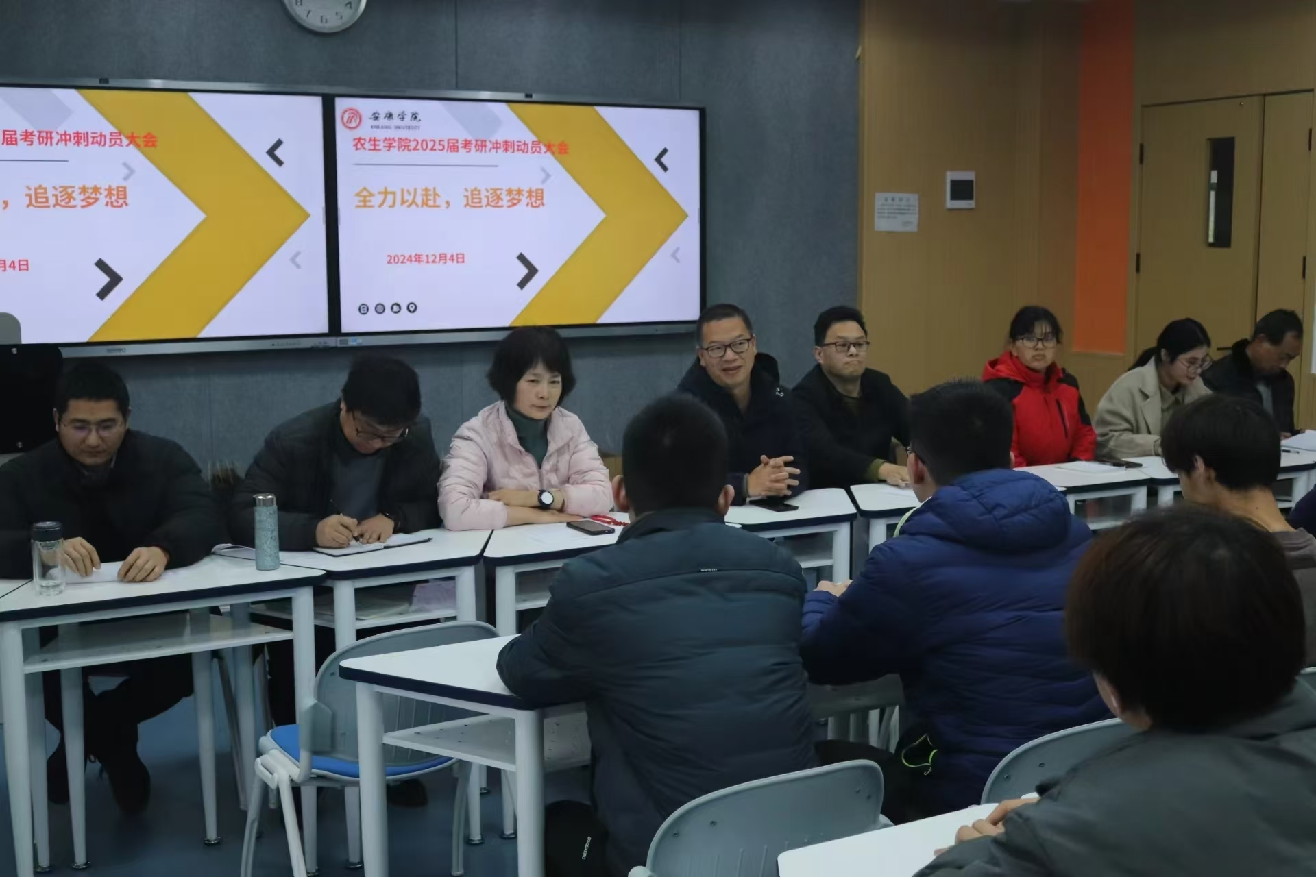2025年全国硕士研究生招生考试即将来临,为鼓励公司考研学子积极迎考,增强考试信心,缓解备考压力,于12月4日下午,韦德1946体育官方入口在1220教室召开2025 届考研冲刺动员大会。公司党总支书记孙保本,副经理李川,经理助理周琼,学工办主任谭自力,辅导员金清民,园林系主任段展展,农学系主任张丽琼,食品系主任梁如,茶学系主任李冬花以及2025届考研员工参会。