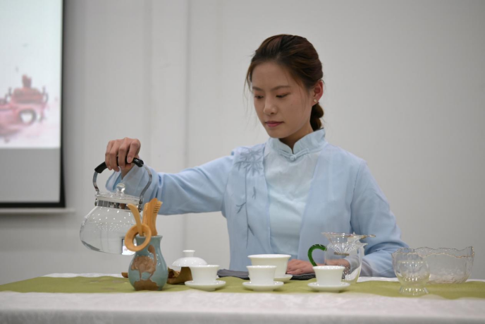 活动中,马瑛老师为大家细致讲解了茶艺六要素,以通俗易懂的方式阐述了各要素在茶艺中的关键作用,帮助大家深入理解了茶艺的内涵。讲解之后,尚稳李同学进行了盖碗分杯冲泡演示,她手法娴熟,行云流水般将所学茶艺知识完美呈现,从温杯洁具到投茶注水,再到分茶敬茶,一系列动作一气呵成,得到了大家一致好评。