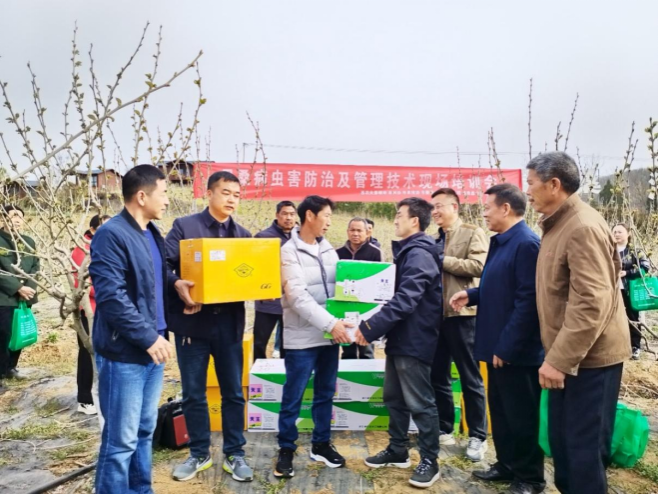 在明星村果桑园,孟刚等为果桑业主培训示范了果桑栽培管理和菌核病防控技术,发放了桑园管理肥料、防治药品和培训资料。在军民村,彭云武等讲授了蚕前消毒、大蚕饲养等技术要点,指导农户做好春季养蚕前的消毒、防病防害准备工作,为农户发放了蚕室消毒物资。