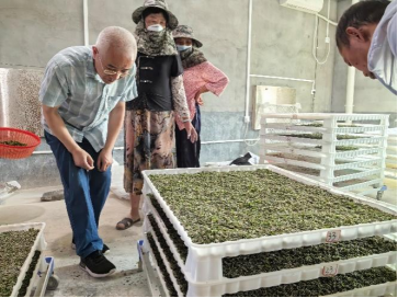 随后调研了小蚕共育情况并对小蚕共育技术开展了研判,建议小蚕共育技术人员需投喂嫩度一致的桑叶,以保证小蚕的整齐度,并详细讲解了提青和石灰消毒的技术要点。