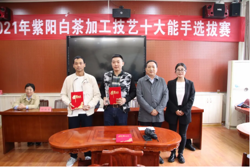 赛前由县总工会联合县茶业发展中心对全县白茶加工厂商进行了初选,共有15个SC 认证茶厂生产的36份2021年白茶样本脱颖而出,参与最终评比,15名优秀白茶制作人参与知识竞答。经过7位评委认真细致地评审,根据送审样本资格审查、品质评审、白茶知识考试得分综合计算,最终评选出紫阳白茶十大能手。李冬花博士为获奖能手颁奖。