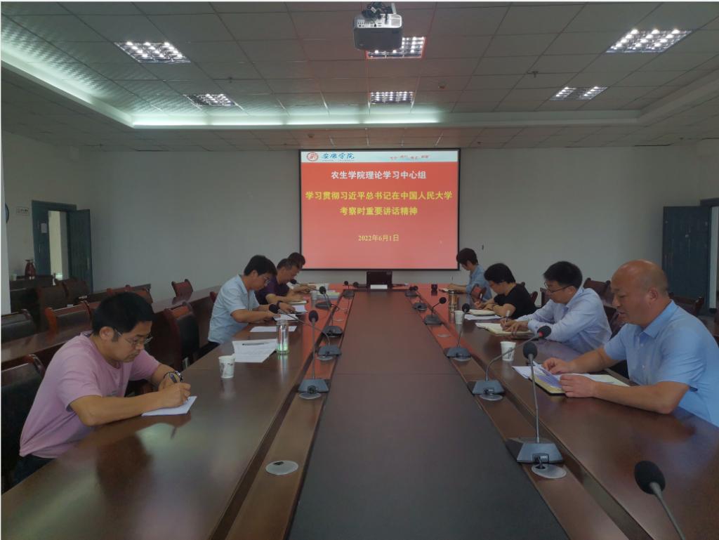 农生公司党总支书记孙保本传达《关于深入学习贯彻习近平总书记在中国人民大学考察时重要讲话精神的通知》文件精神,杨曼领学了习近平总书记在中国人民大学考察时的讲话,李川领学了习近平总书记给南京大学留学归国青年学者的回信。